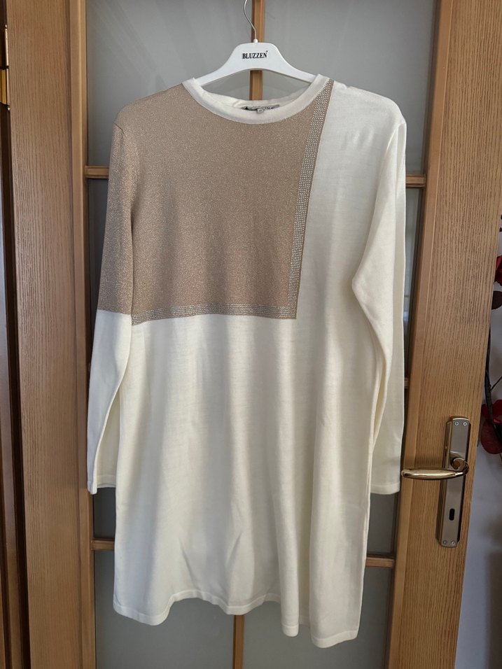 Kadınlar için uzun kollu, yuvarlak yakalı, normal boy midi tunik. triko örme, beyaz ve bej renk simli bloklu, rahat kesim. Rahat ve şık. 1 defa giyildi