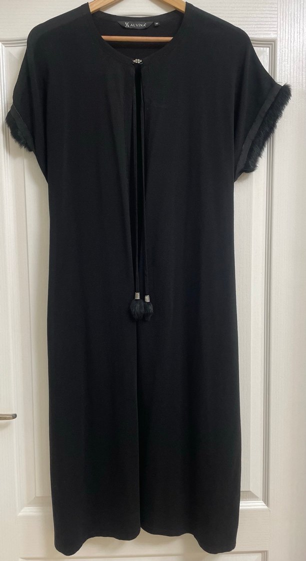 Alvina triko siyah yelek ön kısmında bağcık ve taş detaylı istenirse önden istenirse arkadan bağlamalı kol kısmında tüylüdür temiz az kullanılmıştır tüylenme deforme yoktur omuzdan etek ucu boyu 113 cmdir