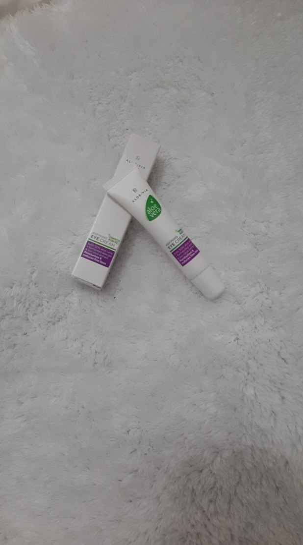 ALVITA Aloe Vera göz kremi, beyaz tüpte mor ve yeşil etiketli. kırıklığın giderilmesini ve ciltte nemlendirici bakım sağlar.