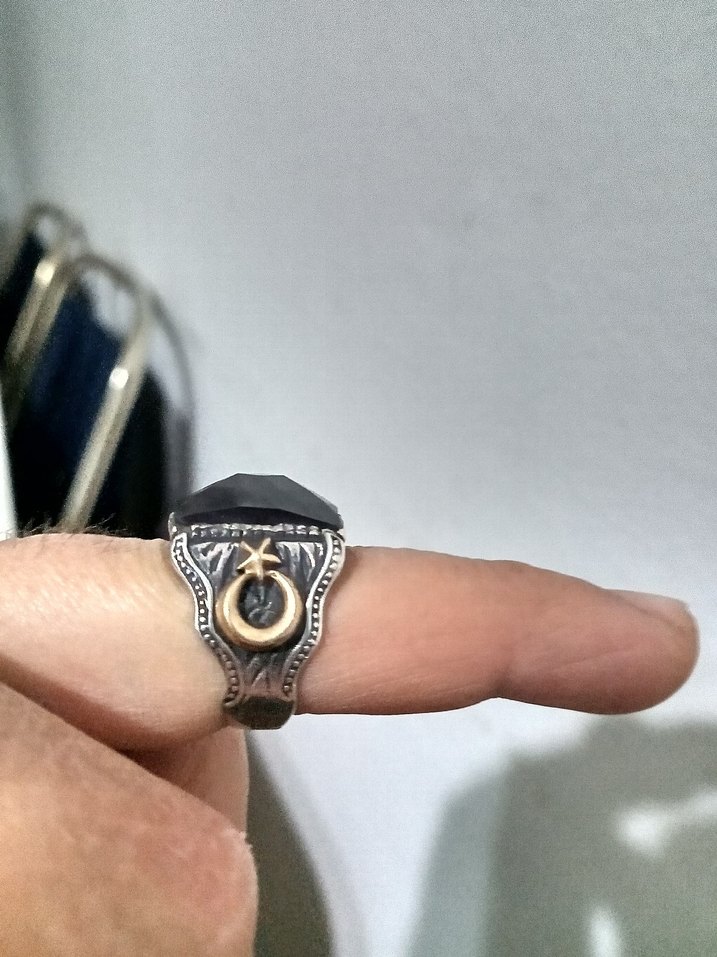 Bu erkek yüzüğü, hilal ve yıldız detaylı koyu siyah gotik tasarıma sahip, mütevazı ve dikkat çekici bir stile sahiptir. 15 Gram olduğu için hurda parasına yakındır