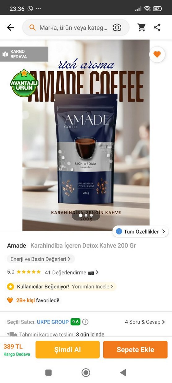 Amade Karahindiba içeren detox kahve, zengin ve koyu aromasıyla 200 gr paket. 2B+ kişi tarafından favorilendi. ☕