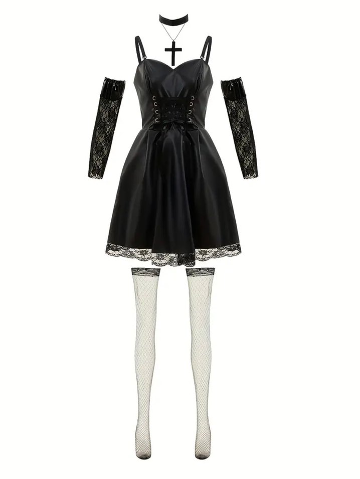 Sıfır, ithal ürün Asian M Eu34 beden. Siyah deri, straplez ve dantel detaylı, vücuda oturan midi elbise. Dantel kolluklar ve haç kolye ile tamamlanmıştır. Gotik parti tarzı için uygun.