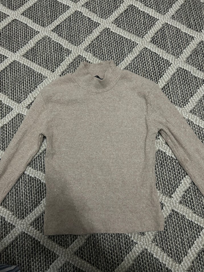 S BEDENE UYUMLU DAHA COK Ambar bej, boğazlı, uzun kollu ve örgü kumaştan yapılmış, normal midi boyda, sade ve desensiz, günlük rahat kullanıma uygun dar kesim triko kazak.
