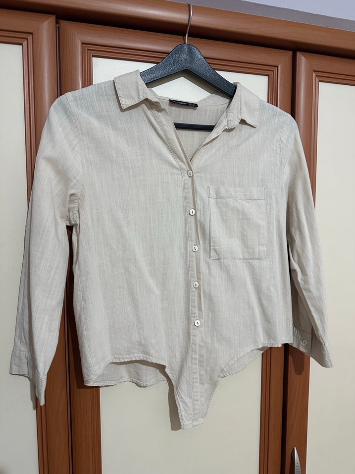Bej renkli keten kadın gömlek, yakalı ve düğmeli. Uzun kollu, bol kesim ve günlük kullanıma uygun sade tasarım. Önden bağlamalı görseldeki gibidir