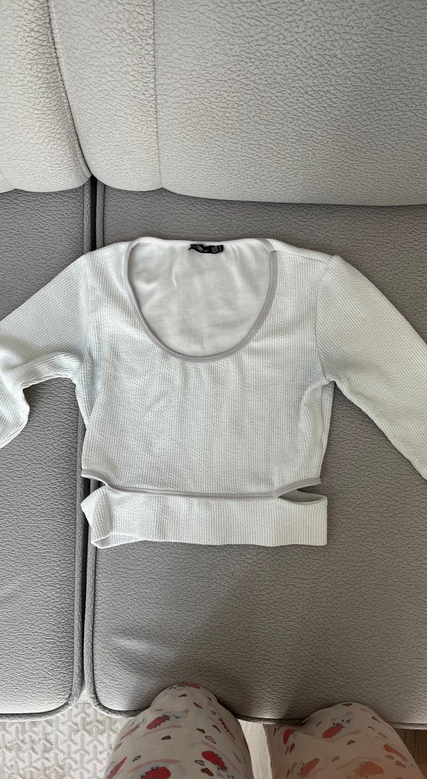 Beyaz, uzun kollu, keten kumaştan crop top. Yuvarlak yaka ve kemer detayına sahip, kısa ve vücuda oturan kesimde, sokak stiline uygun.