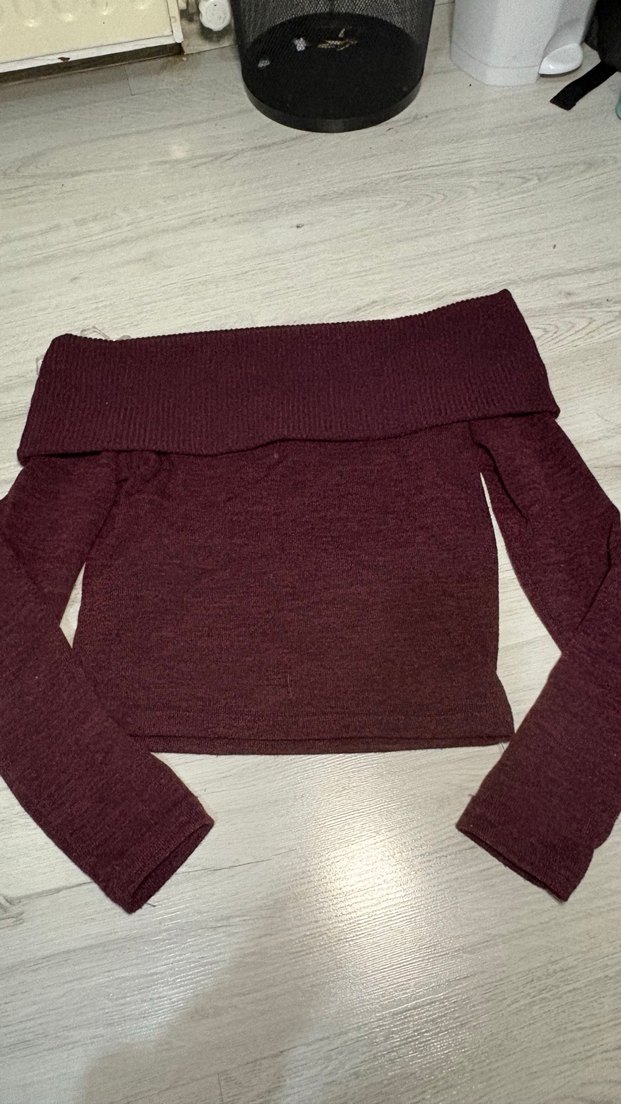 Bordo renk, kayık yaka ve uzun kollu, ince triko dokusuyla rahat ve sade bir günlük kadın kazak.
