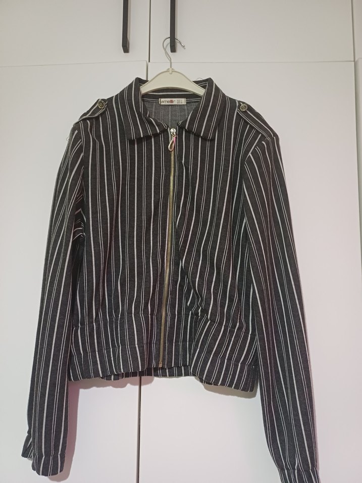 Ambar marka 40 beden çizgili füme ceket. Kumaşı kalınca, mevsimlik veya kışlık kullanıma uygun. Severek almıştım kilo alınca giyemedim sadece bir kez giyildi. Hiç deformasyonu yok tertemiz. İki kol arası 49 cm.