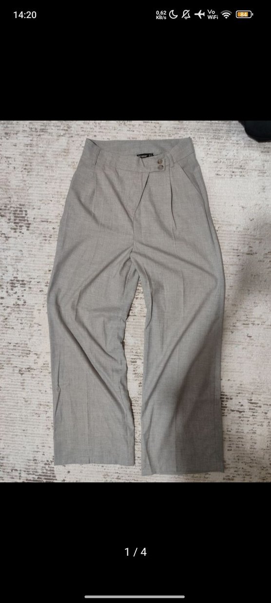 Gri keten kumaştan üretilmiş, düğmeli ve midi boyda kadın pantolon. Ofis için uygun, rahat ve sade tasarıma sahip.