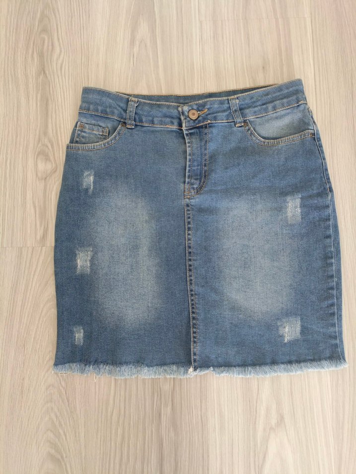 Mavi pastel renkli mini denim etek, bol kesim ve hafif yıpranmış detaylarıyla günlük sokak stiline zahmetsiz şıklık katıyor. Yeni defosuz, sadece 2 kez giyildi