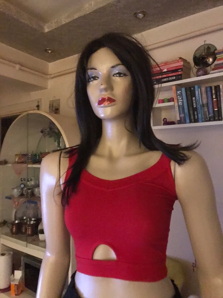 Kırmızı, V yakalı ve kolsuz, sentetik kumaştan yapılmış dar kesim kadın bustiyer. Mini boy ve kesik detaylarıyla rahat ve şık bir görünüm sunar.