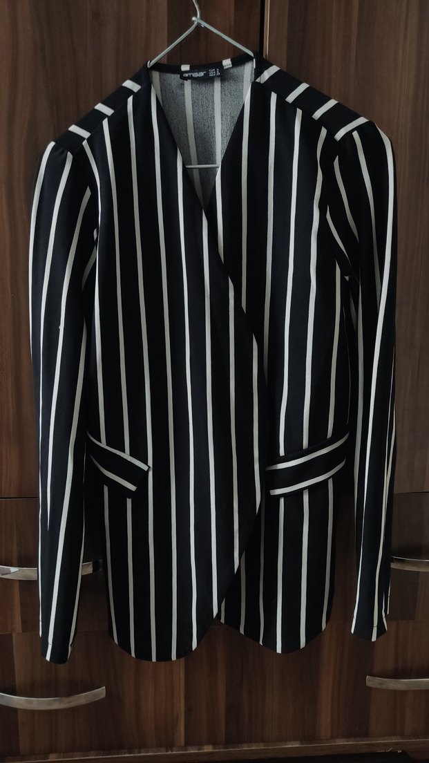 Düğmesiz, siyah çizgili kadın blazer, normal boyda, uzun kollu ve kesimi regular. Ofis için uygun, sentetik kumaştan yapılmıştır. çok çok az giyildi defosu yoktur