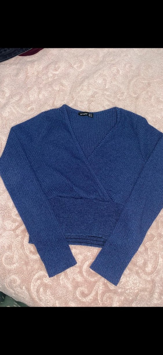 Mavi renginde şık bir crop bluzdur. Kruvaze kesimdir ve üstte duruşu fotoğraftaki gibidir. S beden uyumludur. Çok az, belli belirsiz tüylenmesi vardır