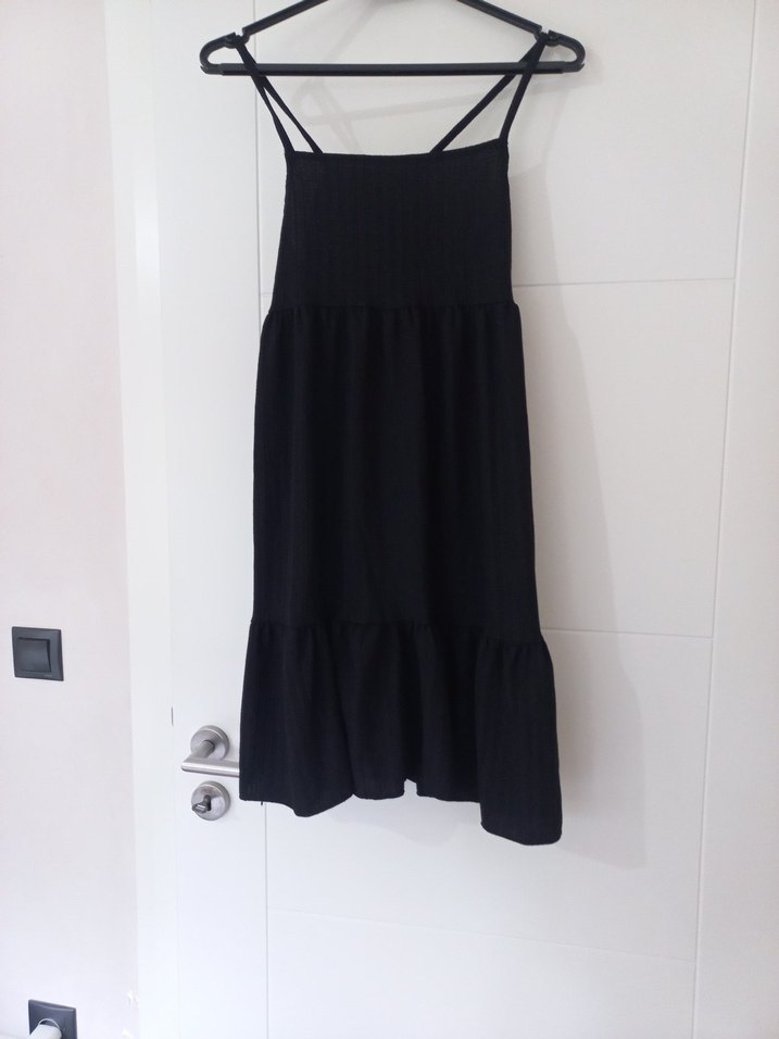 Siyah keten midi elbise, askılı ve volan detaylı, bol kesim konfor sunar. Minimalist gotik tarz, günlük kullanım için uygun. Astarsızdır. S - M beden uyumlu.