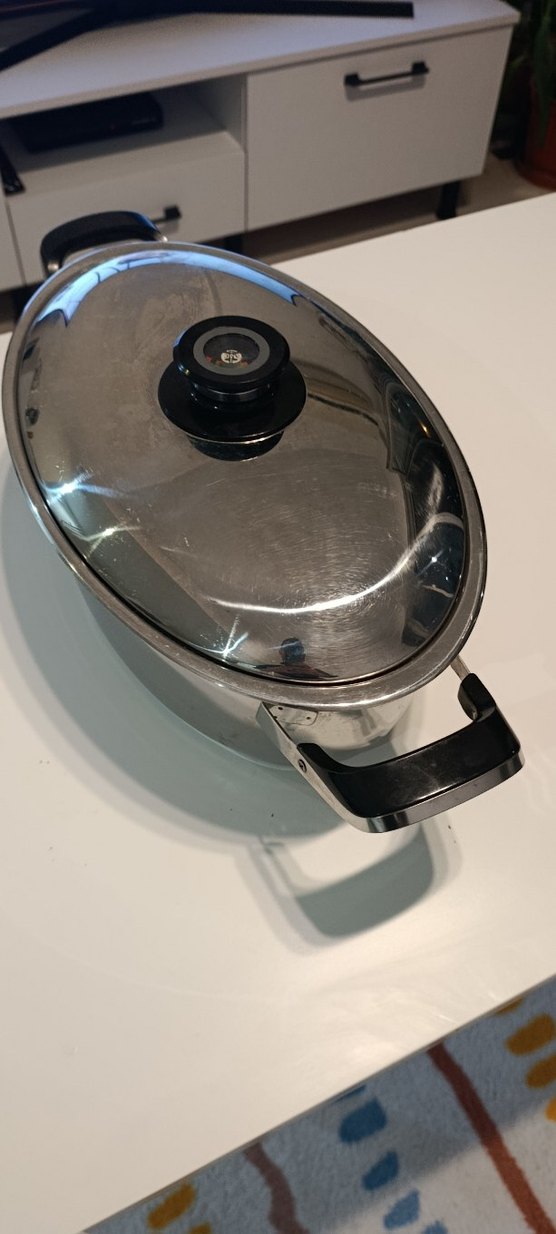 Parlak gri renkte, kapaklı ve siyah saplı büyük tencere, çeşitli yemek pişirme ihtiyaçlarına uygundur.