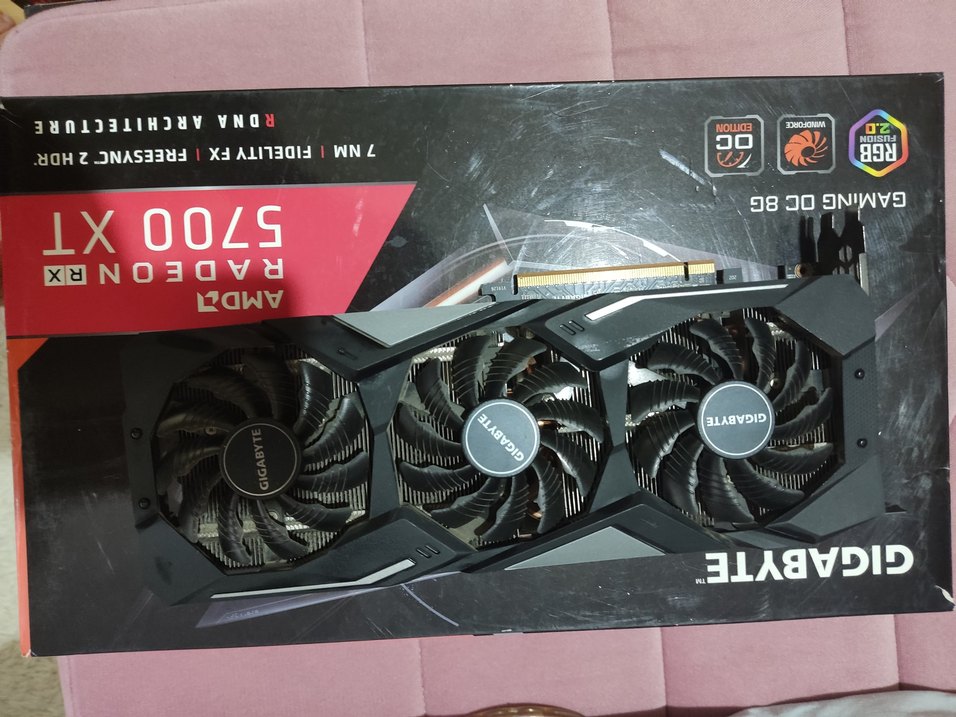 AMD Radeon RX 5700 XT grafik kartı, üçlü fanlı soğutma sistemi ve koyu kırmızı tasarıma sahiptir. Gigabyte markalı ve PCIe desteklidir.