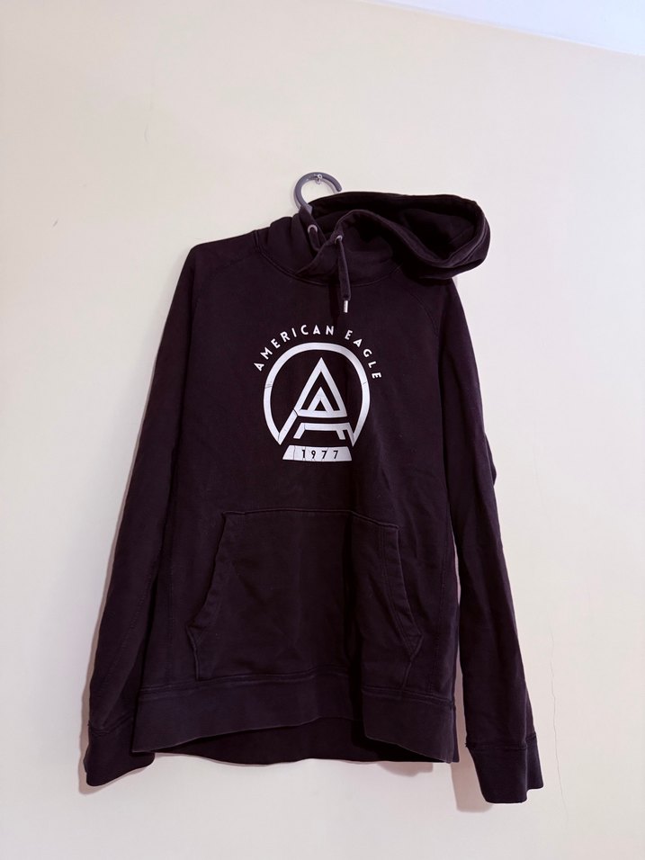 baskılı tasarımı ve yumuşak, sıcak kumaşı ile rahat bir görünüme sahiptir. Uzun kollu ve normal boydadır, günlük sokak stiline uygundur. Logo baskısında sanırım kurutmadan kaynaklı çatlaklar var. Kol bölgedede çok ufak bir leke var. New York American Eagle mağazasından alınmıştır