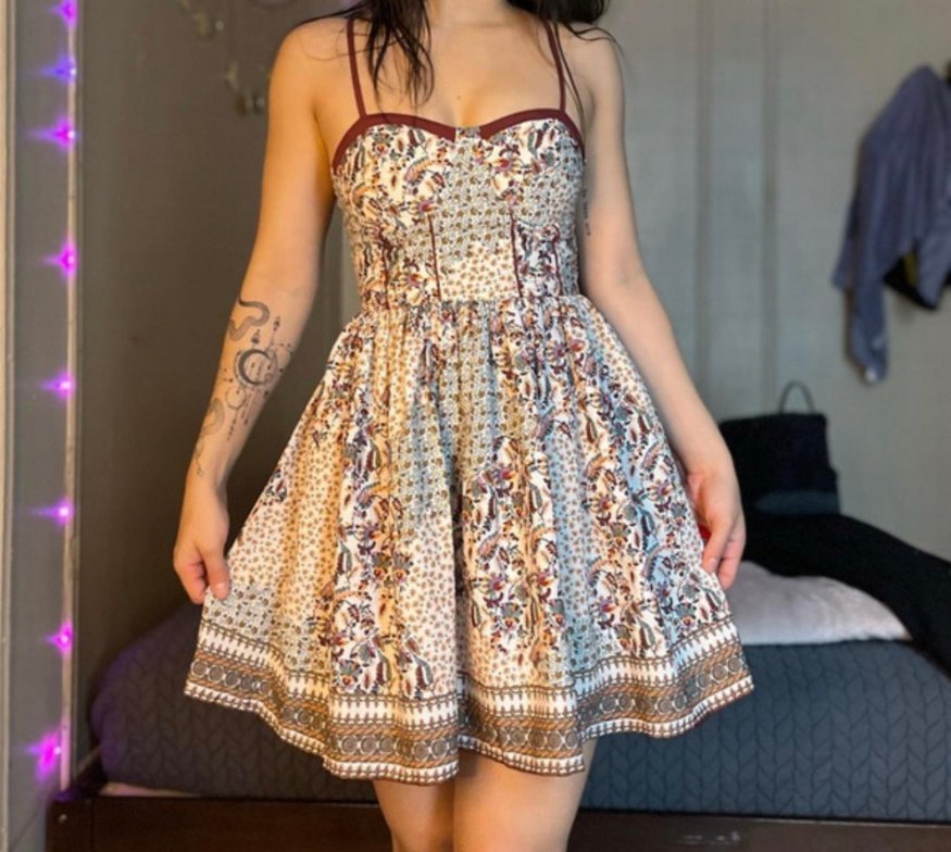 Pamuk kumaştan, askılı ve düğmeli bohem tarzında çiçek desenli mini elbise, romantik akşamlar için uygun.