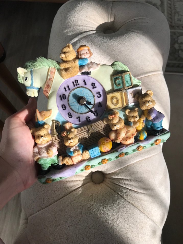 Renkli, üç boyutlu figürlerle donatılmış sevimli masa saati.