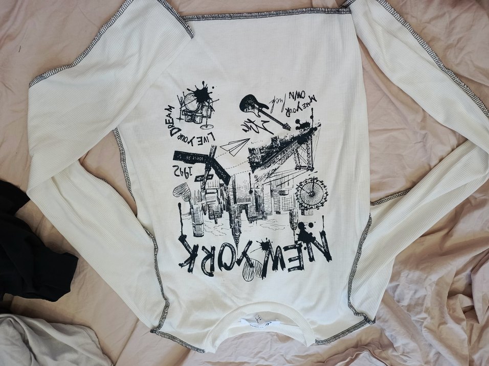 Gri beyaz renkte, pamuklu kumaştan, uzun kollu, yuvarlak yakalı, vücudu sarantişört. Siyah baskılı New York sokak stili deseni içerir. Günlük kullanım için uygundur.