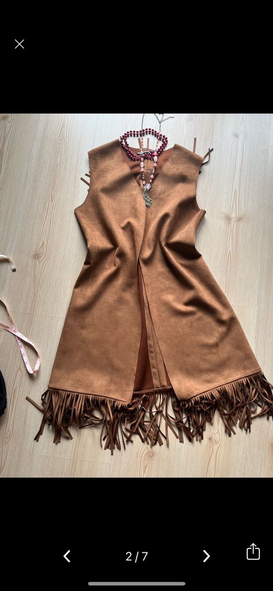 Bu uzun kahverengi süet kadın yeleği, bol kesim ve V yakaya sahiptir, püsküllerle bohem tarzını yansıtır. Günlük kullanıma uygundur. Etiketinde L bd yazıyor ama m giyene de tam oldu. Ölçülerine bakınız. İade yoktur. Defosu yoktur.