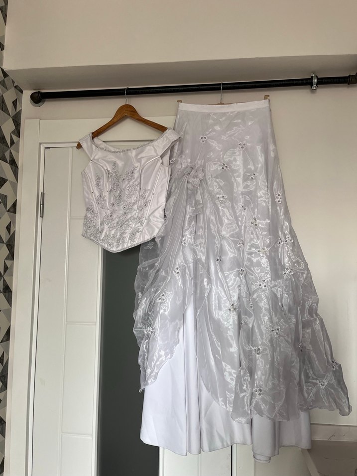 Bu uzun beyaz gelinlik, detaylı straplez üst ve vintage esintili katmanlı bol etek ile klasik ve modern tarzı birleştiriyor. 38 ama 36 bedene anca olur ondan 36 işaretliyorum