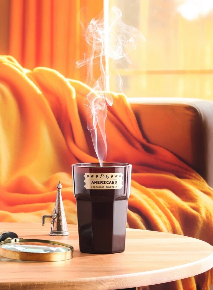 'AMERICANO' etiketiyle cam bardakta , şık bir kapta zengin ve sıcak kokuya sahip mum. Ortama sıcaklık katmak için ideal. ️