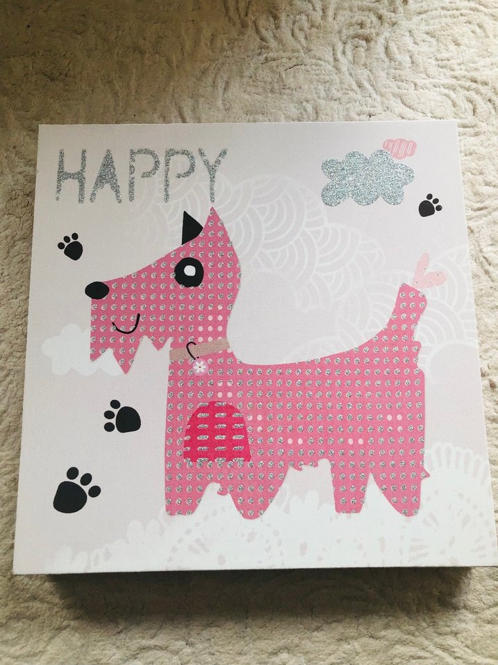 Kapağında 'HAPPY' yazısı ve pati izleri bulunan pembe köpek tasarımlı neşeli tablo 30 cm x 30 cm ebatlarında harika bir tablo Amerika'dan almıştık odanın dekorunu değiştirdik satışa çıkardım.
