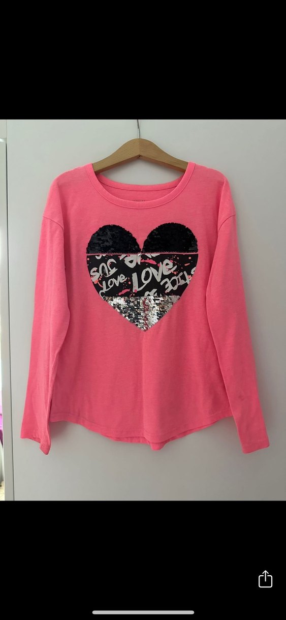 Amerika’dan justice marka yeniden farksızdır çok güzel ince rahat bir kumaş Pembe uzun kollu kız tişörtü, bol kesim ve yuvarlak yaka ile. Yumuşak ve sıcak kumaş üzerine renkli baskılı kalp ve pul detayları bulunur.