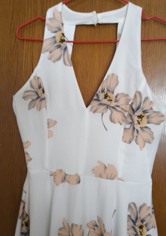 V yaka, kolsuz, midi uzunlukta beyaz elbise. Hafif çiçek desenli, sentetik yumuşak kumaştan, drapeli ve vücuda oturan kesime sahip.