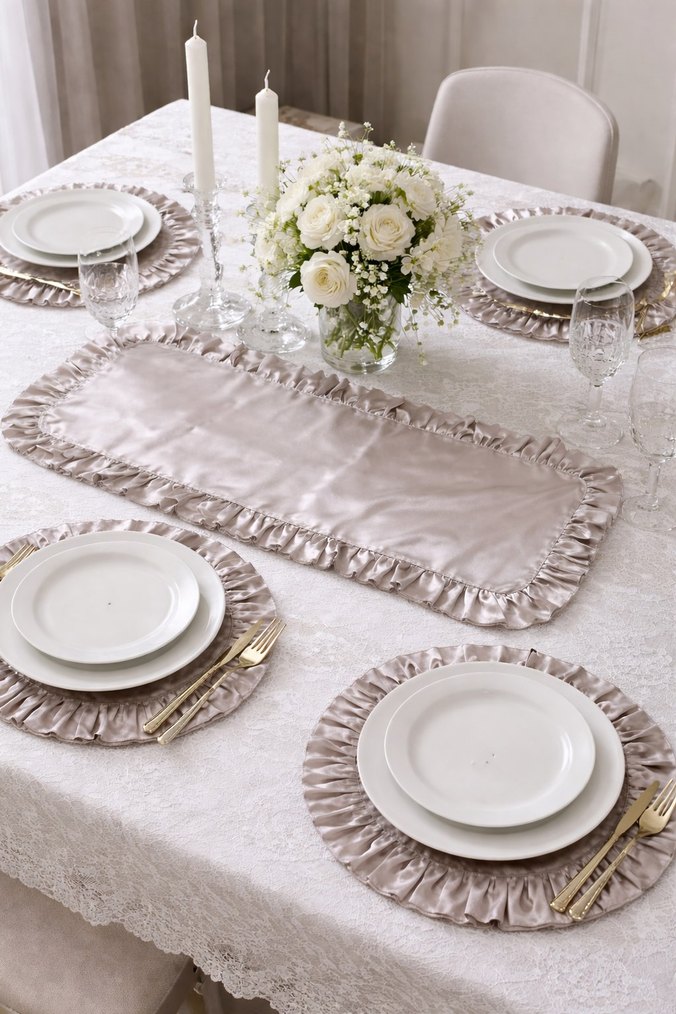 Modern klasik tarzda, pudra fırfırlı amerikan servisler ve örtü ile şık bir görünüm sunar. ️4 adet firfirli supla ve bir ranir ölçüleri supla 38cm ranir 46en 96 boyunda hepsi fiyata dahildir masa uzerindekiler dekor amaclidir satılık degildir 4 supla 1 ranir