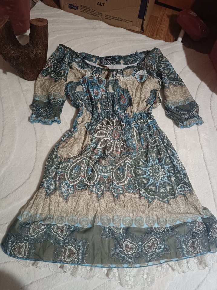 Turkuaz ve gri tonlarda, dantel detaylı, kısa kollu, bol kesim Amerikan Vintaj dizde elbise. Günlük ve Gezmeklik kullanıma uygundur.
