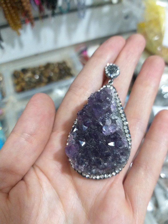 Bu bohem tarzda kolye ucu, mor parlak taşlarla ve desenli detaylarla süslenmiştir, düğünler için uygundur. Parlak ve retro bir hava taşır.