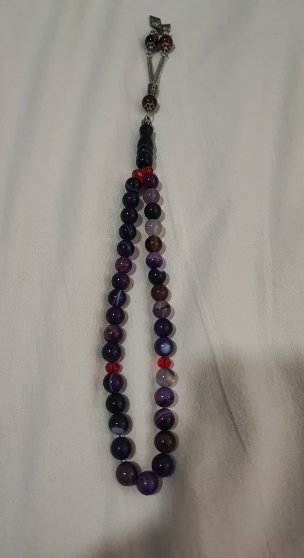 Koyu mor bohem tarzda, yuvarlak boncuklar ve kırmızı detaylarla erkek tesbihi. Özel kullanım için şık bir aksesuar.