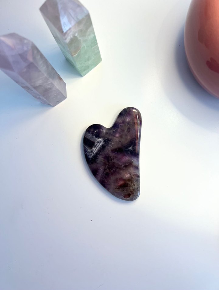 Doğal ametist Gua Sha. Düzenli kullanımda yüz kaslarını rahatlatır, kan dolaşımını destekler. Yüz yogasıyla birlikte şişkinliği azaltmaya ve cilt tonunu eşitlemeye yardımcı olur