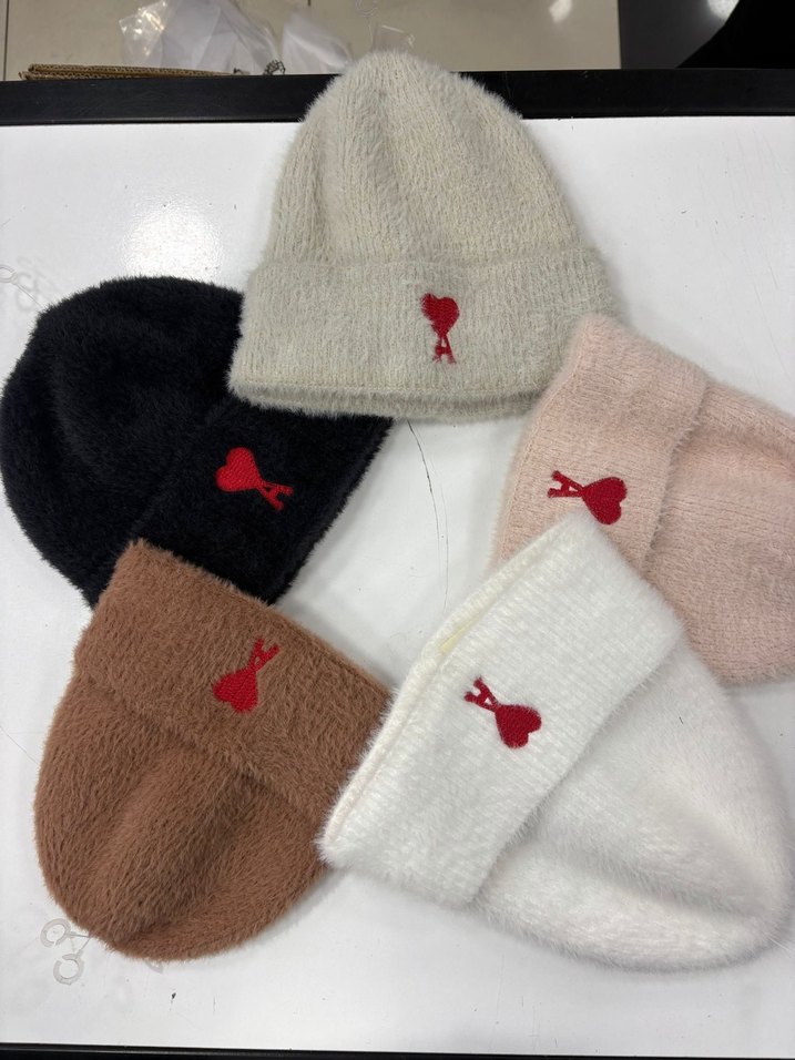 Yumuşak dokulu beyaz triko bere, küçük kırmızı kalp nakışı ile trend sokak stili için uygun.