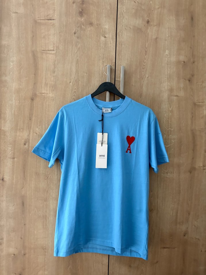 Mavi pamuklu tişört, kısa kollu ve yuvarlak yakalı. Rahat kesim ve küçük kırmızı baskılı kalp detayıyla günlük kullanıma uygun.