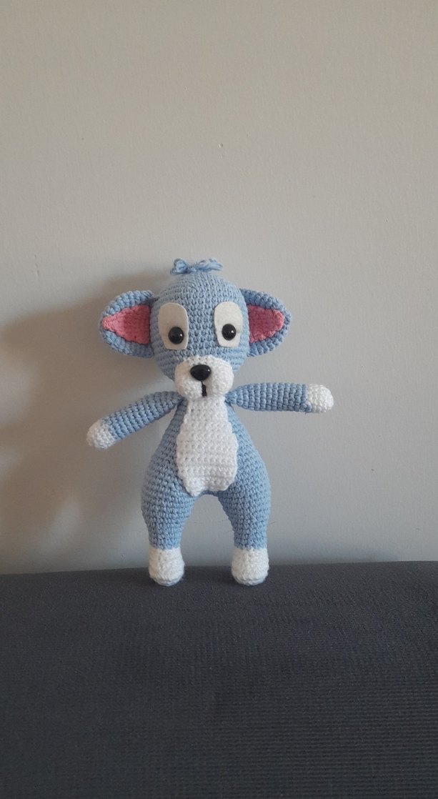 mavi renkli, el örgüsü amigurimi büyük gözleri ve pembe kulak içleriyle sevimli bir tasarıma sahiptir.