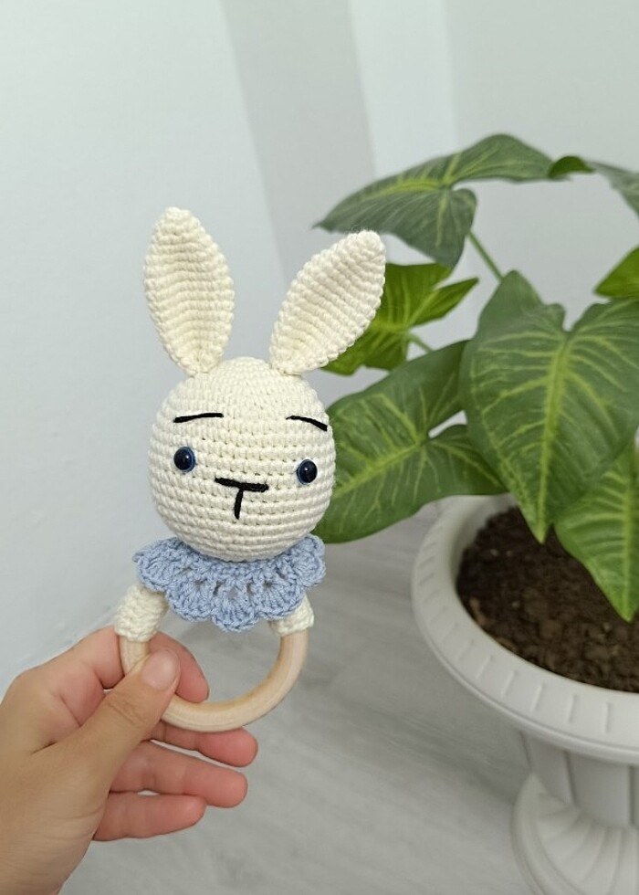 Amigurimi çıngırak aynı zamanda ahşap halkası sayesinde diş kaşiyici olarak kullanılmaktadır tüylenmez ip ile örülmüştür.
