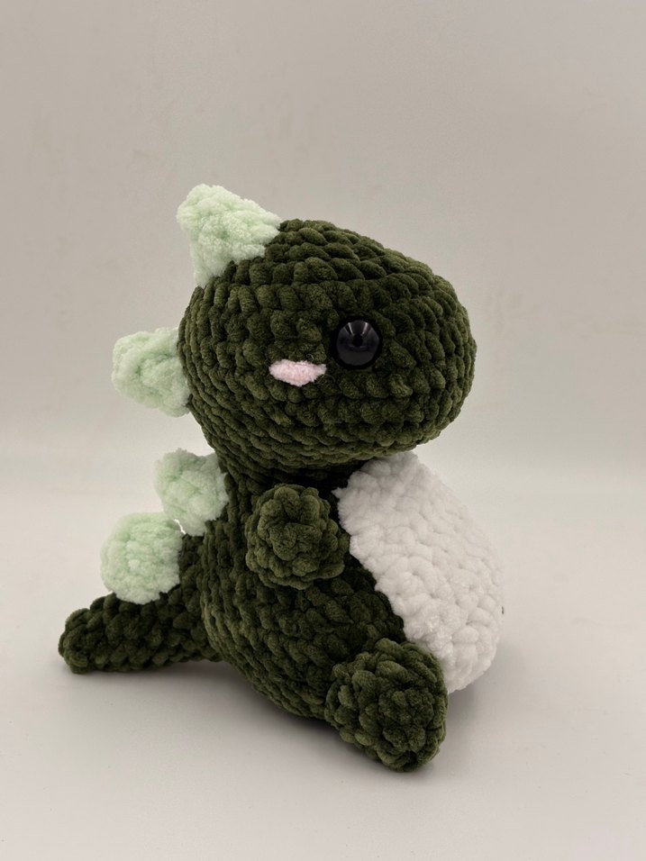 Yumuşak peluş dinozor oyuncak, yeşil renkte, açık yeşil dikenleri ve beyaz karnı var. Dokulu ve tüylü yüzeye sahip, siyah gözlü.