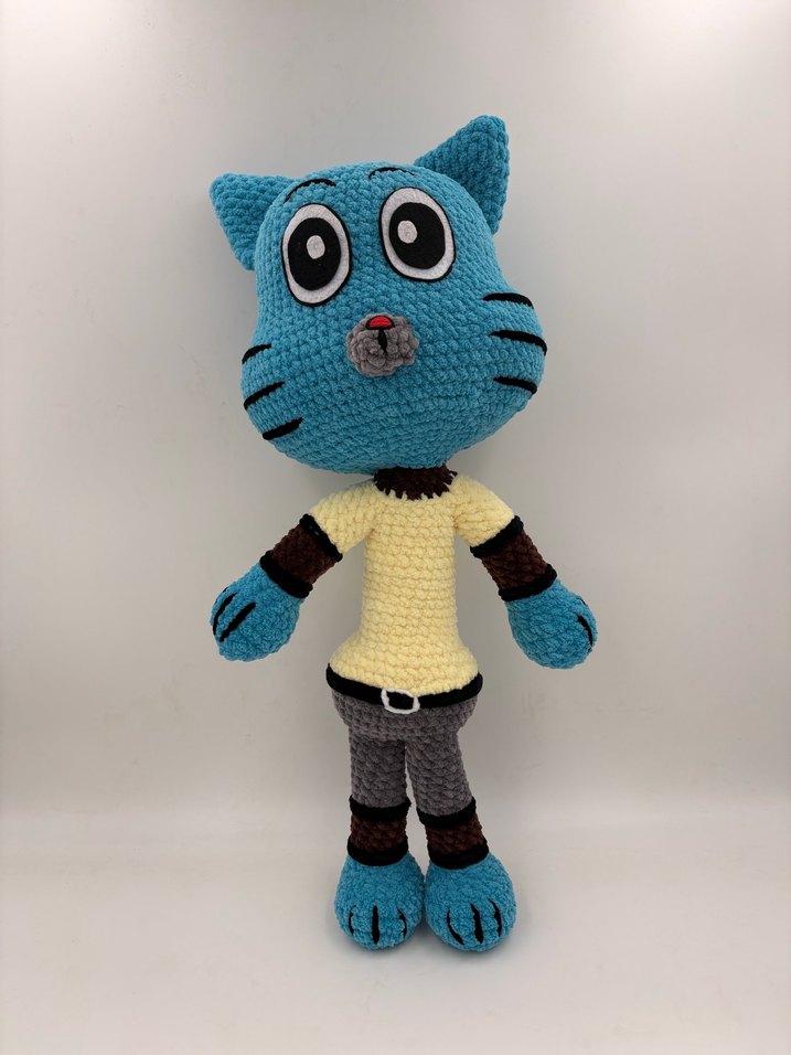 Büyük gözlü, detaylı dikişli renkli örgü kedi peluş oyuncak. Yumuşak ve sevimli yapıda.