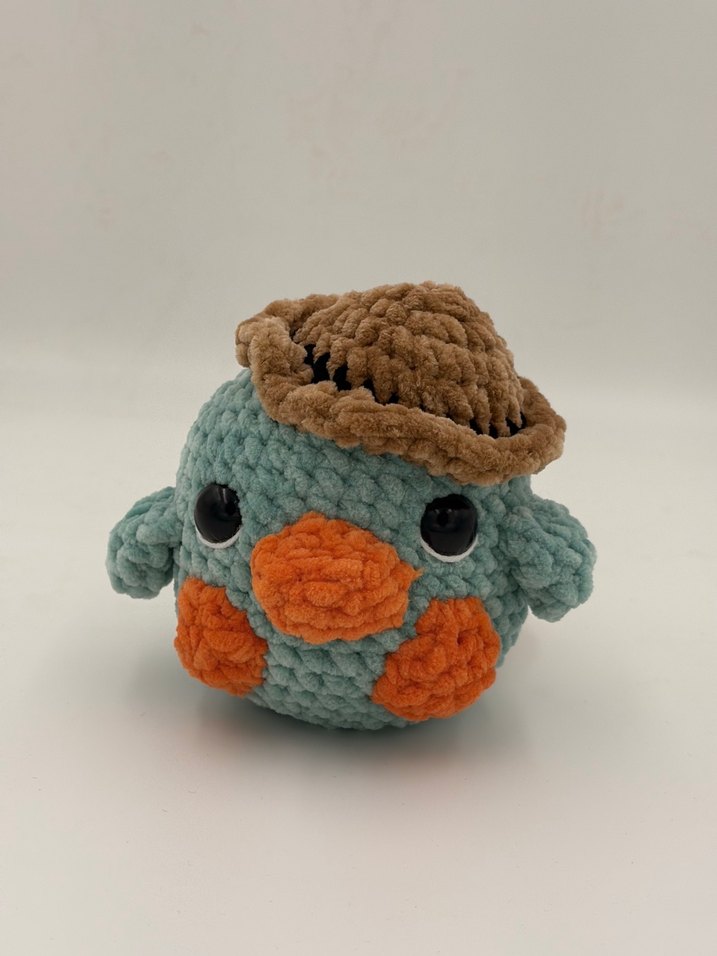 Turkuaz renkte, turuncu yanaklı ve kahverengi şapkalı yumuşak peluş kuş oyuncak. Detaylı dikişlerle sevimli ve sarılmalık.