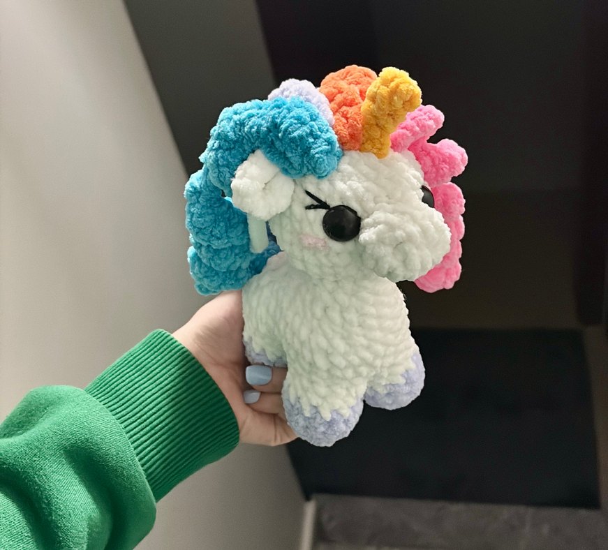 Yumuşak ve kabarık dokusuyla çok renkli unicorn peluş oyuncak, canlı renklerde yele ve kuyruğa sahiptir.