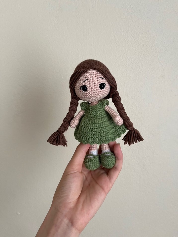 Kahverengi örgü saçlı, pastel yeşil elbiseli el yapımı örgü bebek. İstediğiniz renklerde ördürebilirsiniz.