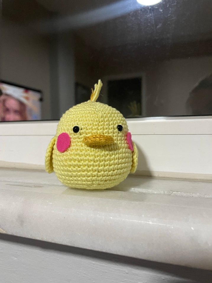 Renkli sarı örgü civciv, pembe yanakları ve küçük kanatlarıyla yumuşak oyuncak. Amigurumi