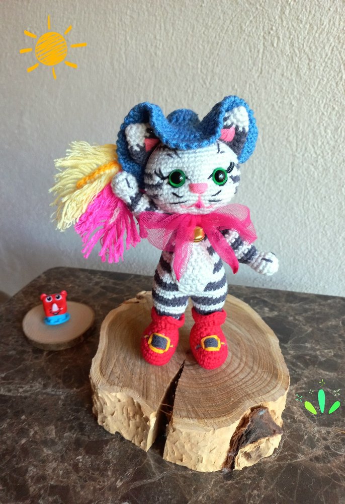 Amigurumi iplerle örülmüştür topaklanma yapmaz ve yıkanabilir. Şapka, iki tane fluarı ve tüyleri çıkartılabilir şeklindedir. Boyu yaklaşık 15-18 cm civarındadır. #amigurumihediye#çizmelikedi#oyuncak#örgüoyuncak#