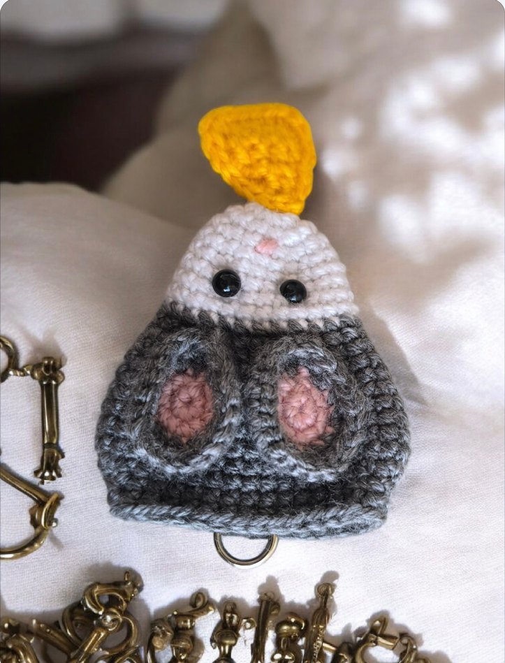 Gri örgü tasarıma sahip, sarı peynir detaylı rahat bir anahtarlık. Anahtarlarınıza sevimli bir dokunuş katıyor. Peynir yakalayan fare anahtarlık