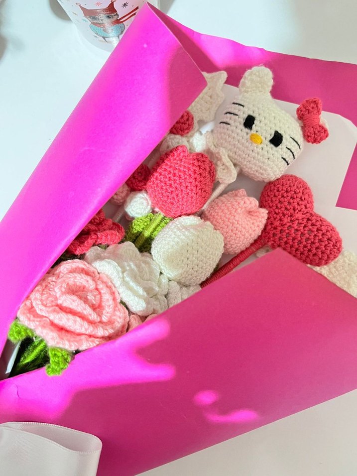 El yapımı amigurumi Hello Kitty, kalpler ve çeşitli çiçeklerden oluşan, parlak pembe kağıda sarılı buket. Sevimli bir hediye olarak uygun.