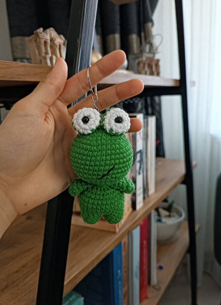 Büyük beyaz gözlü renkli yeşil örgü kurbağa amigurumi anahtarlık olarak sevgiyle örüldü. Kaliteli, el yapımı detaylı dikişlere sahip.