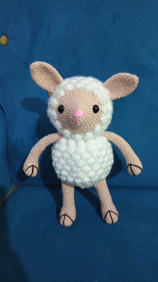 Beyaz pastel tonlarda, yumuşak örgü dokusuna sahip sevimli bir kuzu peluş oyuncak. Detaylı yüz ifadeleri bulunur.