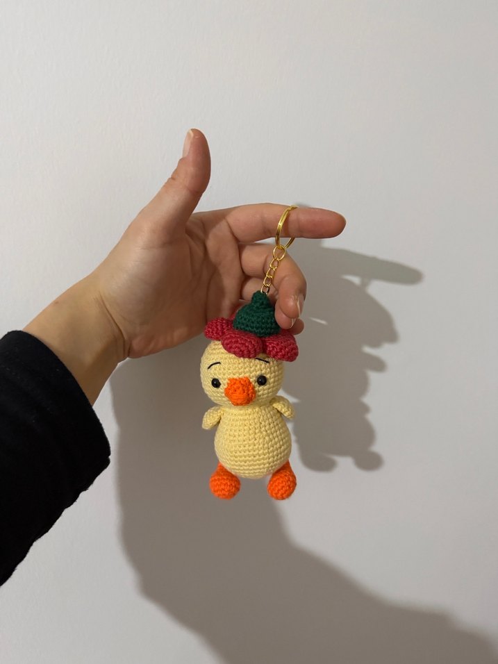 Renkli örgü malzemeden yapılmış, çiçekli şapkalı sevimli ördek figürlü bohem tarzda anahtarlık. Retro ve hippie havası katar.